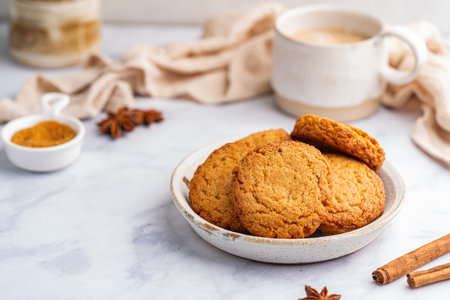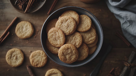 Homemade cookies arranged in a bowl with spices on a wooden table setting