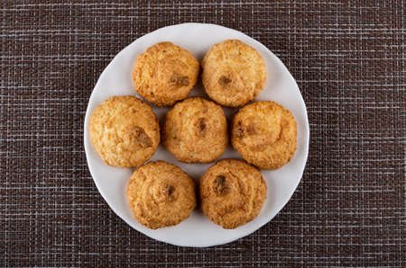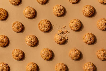 Background with Amaretti cookies pattern. Italian almond pastry, biscuits on a monochrome caramel color background.