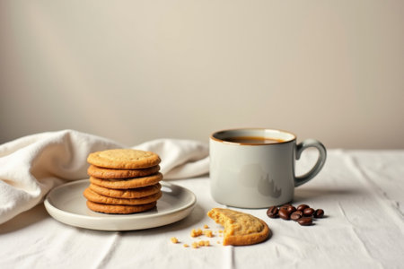 A cup of coffee rests on a light tablecloth. Next to it lies a begging cookie, while a plate with stacked cookies can be seen in the background. A few scattered coffee beans complete the calm scene.