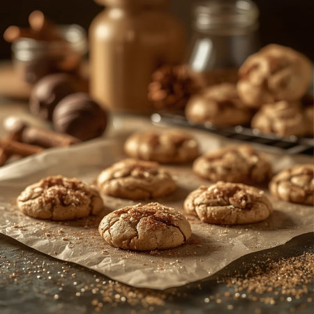 Freshly baked cinnamon cookies arranged beautifully on a countertop with cinnamon sticks