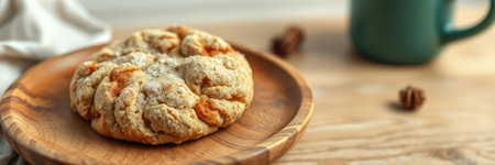 Freshly baked cookie on a wooden plate accompanied by a green cup at a cozy indoor setting
