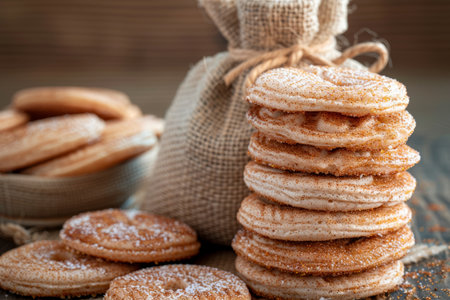 Stack of Homemade Cinnamon Cookies Tied with Rustic Twine in a Sack on a Wooden Table