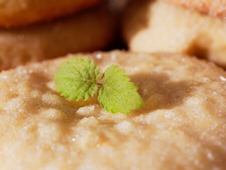 Sprig of lemon balm close-up on sugar cookies. Melissa dish decoration.