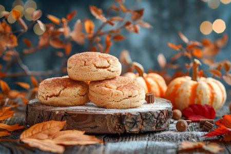 Autumnal Food Concept with Pumpkin Spice Cookies, Fall Leaves, and Seasonal Decorations on Rustic Wooden Table AI Generative
