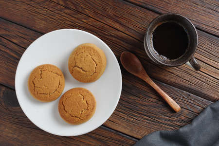 Close up of homemade ginger cookies, cinnamon, ginger on a wooden table. Copy space. Vintage toned image, flat lay