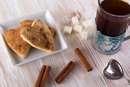 Glass of tea with cinnamon cookies on wooden background.