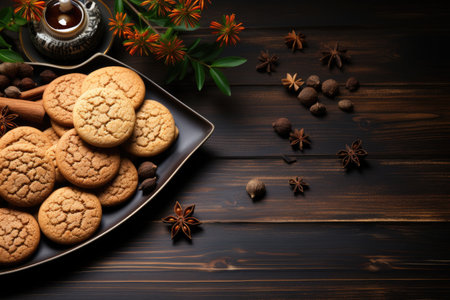 Close up of homemade ginger cookies, cinnamon, ginger on a wooden table. Copy space. Vintage toned image, flat lay