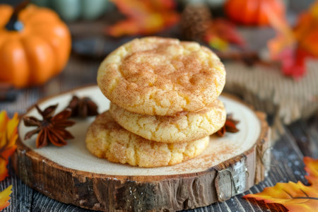 Delicious Homemade Snickerdoodle Cookies on Wooden Cutting Board with Autumn Leaves and Pumpkins AI Generative