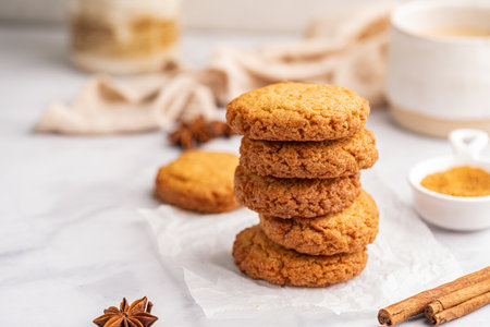 Homemade oatmeal cookies with cinnamon on baking paper, selective focus