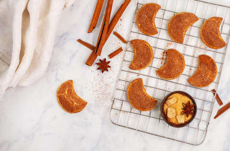 Freshly baked homemade cinnamon cookies with brown sugar and star anise spices. Christmas treat with tea and coffee. Selective focus, top view