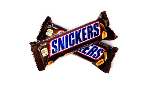 June 2020. Kiev, Ukraine. Two small single bars of snickers of 50 grams lie one on top of another in the form of a cross on a white background. Top view and side view in macro. Snickers bar is lying on another bar.