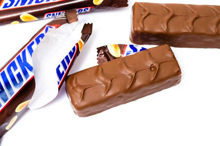 Ukraine, Kiev March 29, 2018. Chocolate Snickers on a yellow background. Snickers bars are produced by Mars Incorporated.