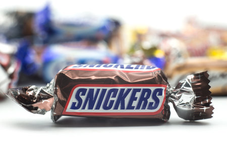Tyumen, Russia-June 11, 2020: Snickers is a brand name chocolate bar made by the American company Mars.