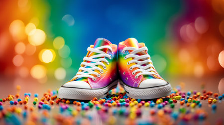 shoes with rainbow colors stand out against a vibrant cotton candy background. this captivating photo, taken with a nikon d750, showcases the unique style of tilt-shift lenses and dot-painted colors. the optical blending creates an aurorapunk effect, resulting in a bold chromaticity. with its saturated color scheme, this contest-winning image is a true visual delight. ai generated