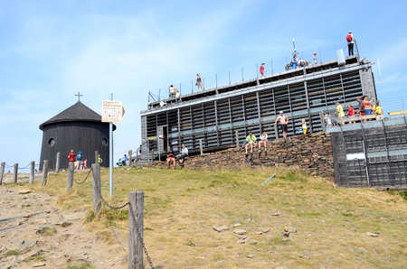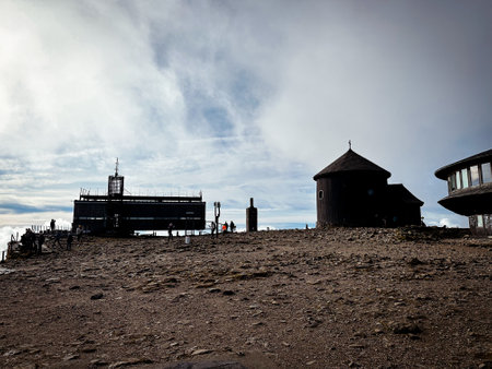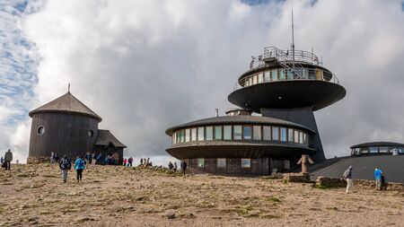 Karpacz, Sniezka Mountain, Poland September 23, 2022: High Mountain Meteorological Observatory. Tourists on top of Snezhka Mountain. Poland