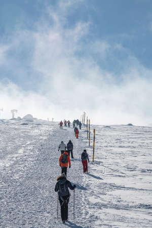 KARPACZ, POLAND - MARCH 08, 2020: Tourist trail to Sniezka (mountain on the border between the Czech Republic and Poland). Winter landscape. Giant Mountains, Poland, Europe.