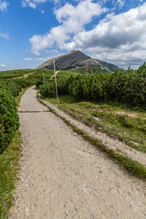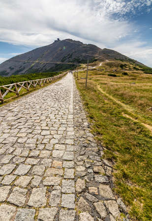 View of Sniezka in summer. The highest peak of the Karkonosze Mountains. Tourists join the mountain trail. Karkonosze National Park