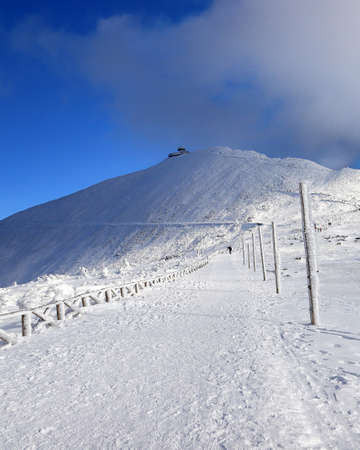 Snezka or Sniezka (in Czech and Polish) is a mountain on the border between the Czech Republic and Poland. Winter landscape. Giant Mountains, Poland, Europe.