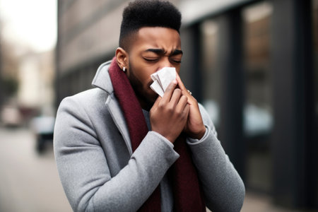 Young african american man blowing nose with tissue. Cold or flu concept for health and illness awareness.