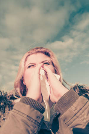 Seasonal flu, cold, runny nose concept. Sneezing blonde young woman into tissue, outside sunny winter shot