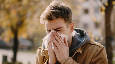 Young man sneezes because of an allergy to ragweed, generative ai illustration