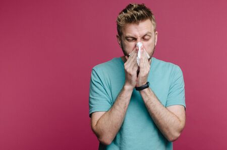 Man having flu, sneezing into hygienic tissue. Guy being sick, allergic blowing his nose.
