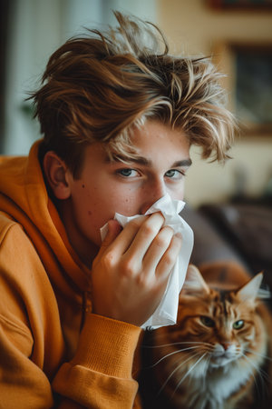A Caucasian man is using a cloth to wipe away mucus from a sneeze due to an allergy to cat fur in the house.