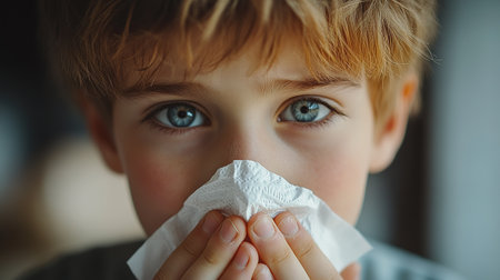 Closeup of a young ill boy blowing his nose into a tissue, providing ample space for text placement