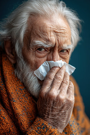 An elderly European man blows his nose, sneezes and coughs into a napkin. Coronavirus infection.