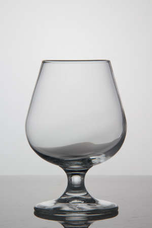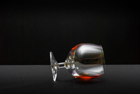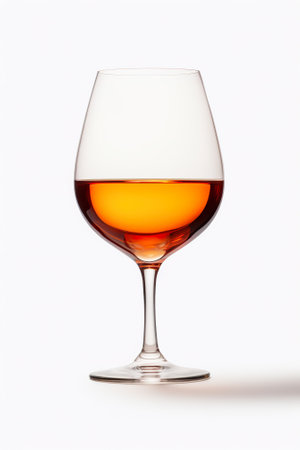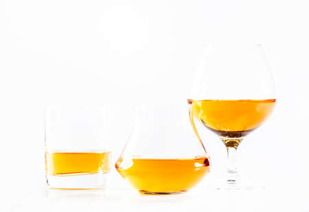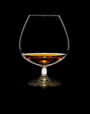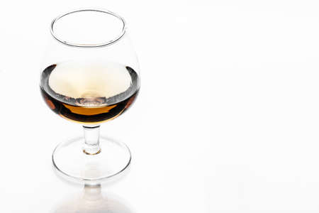 Brandy glass isolated. Cognac alcohol background. Golden liquor closeup. Empty copy space isolated object. Reflective bar surface.