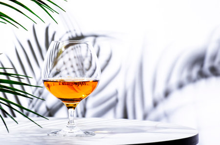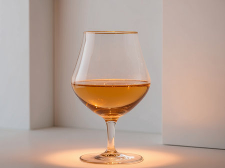 A glass of Cognac is elegantly placed on a table, catching the sunlight streaming through the window. The stemware glistens with the golden liquid of the alcoholic beverage