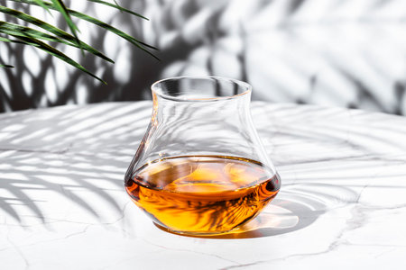 Image of a Glencairn single malt whisky glass, with light and shadows in the background.