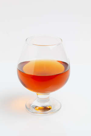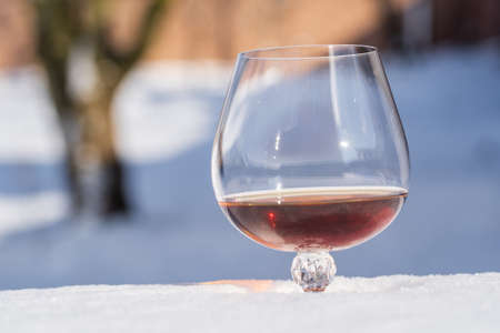 Glass of cognac on a bed of snow and white background, close up. Concept of christmas winter morning