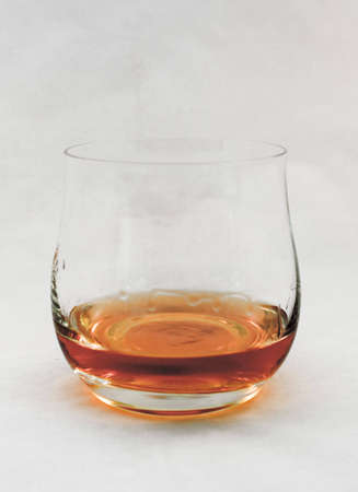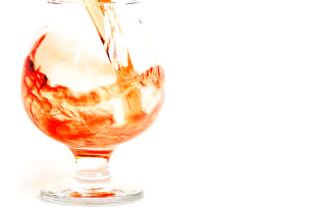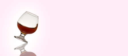 Glass glass with an alcoholic drink or cognac and splashes on a light background. Isolated, banner.