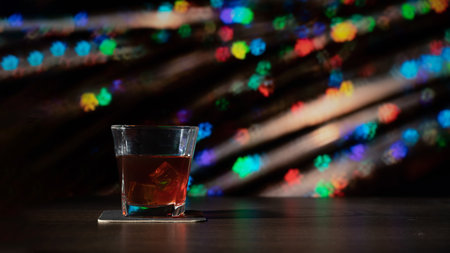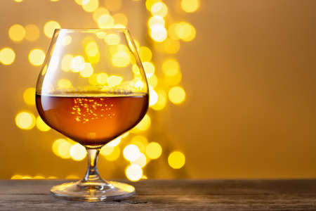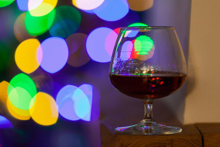 Festive mood. An elegant glass of cognac against the background of multi-colored blurred round lights. close-up