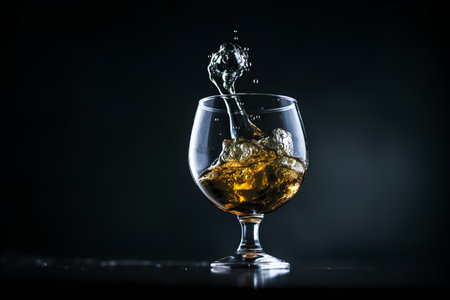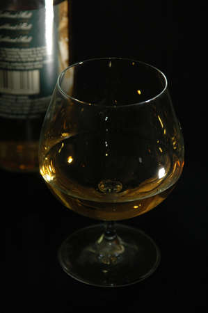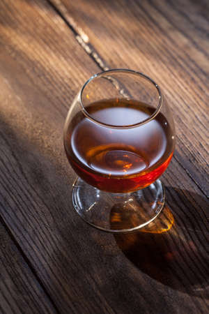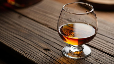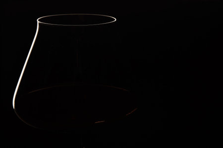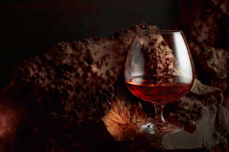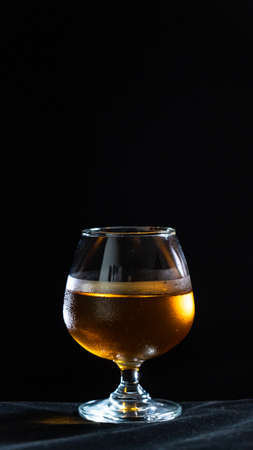 snifter of brandy in elegant typical cognac glass on dark background with space for text
