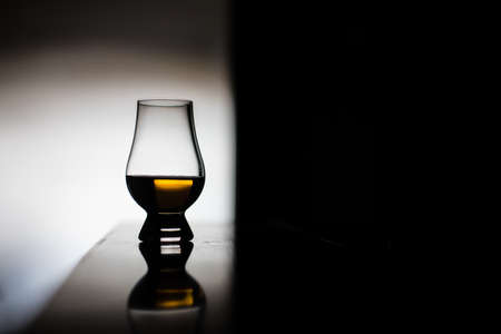 Close up shot of a Glencairn whisky glass, with copyspace to the right.
