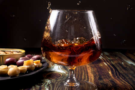 Cognac with ice sprinkled from a glass. Snack for cognac: pickled mushrooms champignons, olives and sprats. Splashing alcohol.