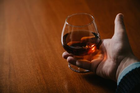 Male hand with glass of whiskey or brandy. Alcoholic drink. Tasting, tasting. Party, holiday