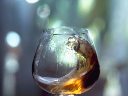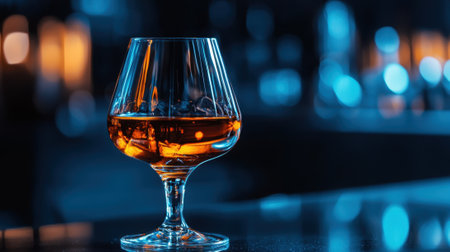 snifter of brandy in elegant glass with space for text on light tint blue disco background