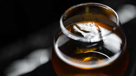 Cognac glass with ice cubes on the table with a luxury leather black background - close-up product photo