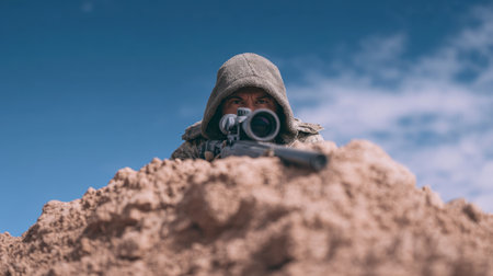 A skilled sniper in camouflage gear is in a focused position, aiming through a high-powered scope on a sandy landscape under a clear blue sky.
