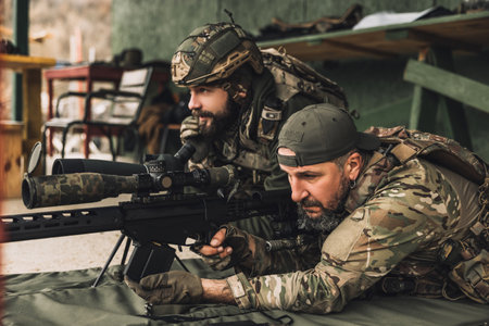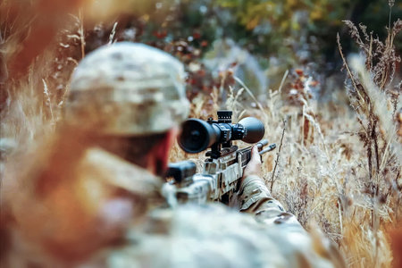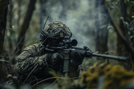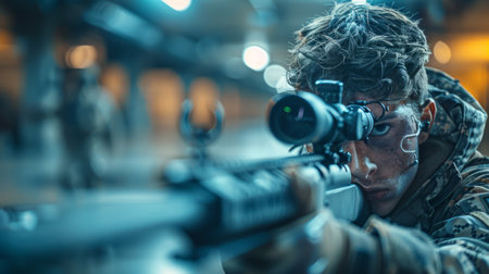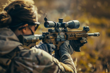 Focused soldier takes aim with a rifle during a training exercise, demonstrating precision and concentration