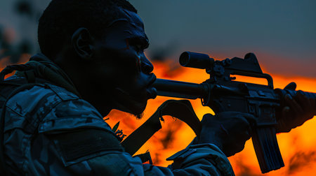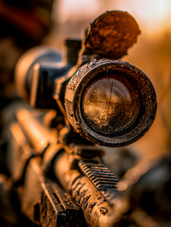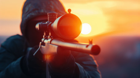 Armed soldier aiming through a scope at sunset, symbolizing military power, precision, and defense.