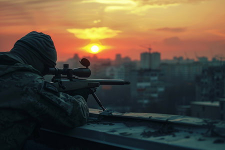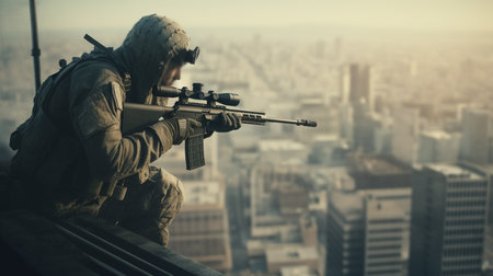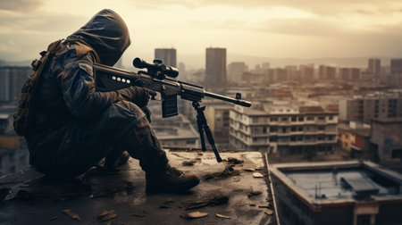 Sniper stationed on a building aims at his target Generated by AI . High-quality photo