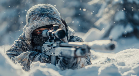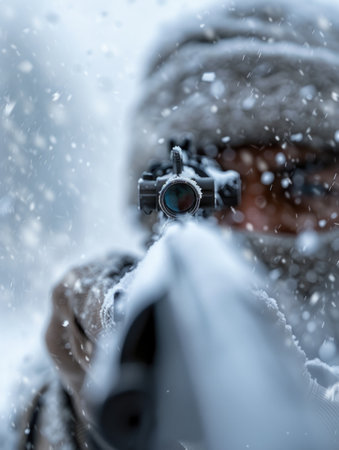 Focused marksman in winter gear aims carefully through a scope amid frosty landscapes, blending precision with a tense and crisp atmosphere.