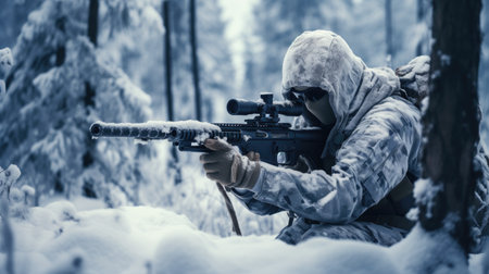 A soldier dressed in winter camouflage is focusing intently through the scope of a sniper rifle while stationed in a snowy forest. The atmosphere is tense and serious.