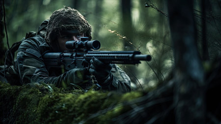 Deep within a dense, moss-covered forest, an elite sniper lies perfectly still, concealed in a ghillie suit. Blending seamlessly with the natural terrain, they patiently watch their target, a silent and unseen guardian embodying the essence of stealth and precision.