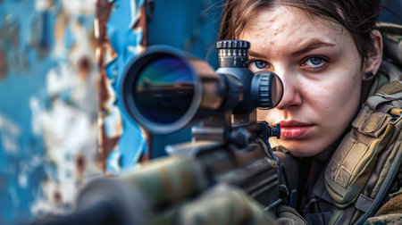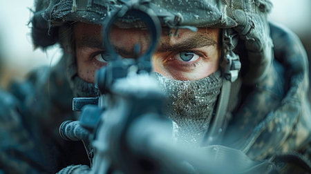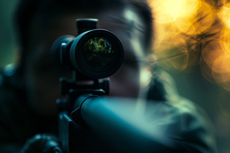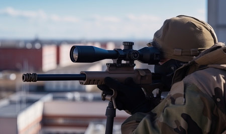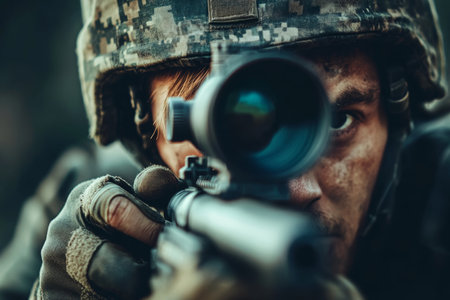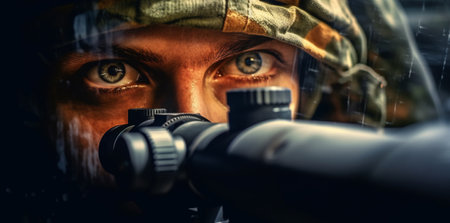 Close up of an elite army sniper aiming with optical sight in a military operation setting