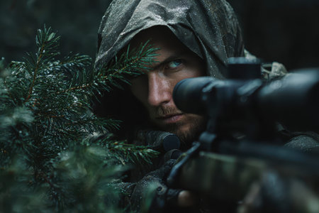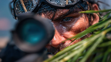 A soldier focuses intently on his target while camouflaged in dense foliage. Sweat glistens on his skin as he prepares for a critical shot during a military operation.